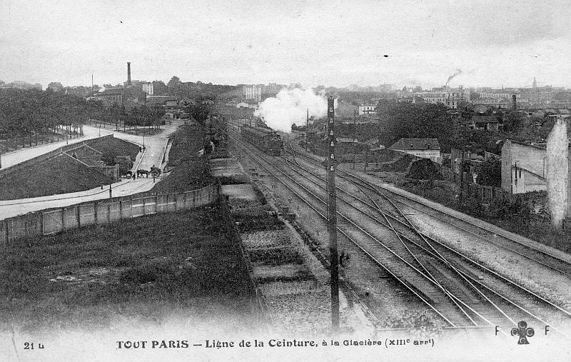 La gare aux marchandises de La Glacière-Gentilly fut ouverte le 15 novembre 1882. afin de desservir les 13e, 14e et 15e arrondissements. Elle resta active jusqu’au début de 1993, fin de tout trafic régulier de marchandises sur la Petite Ceinture. Amputée de sa partie Ouest, de la rue de l’Amiral Mouchez à la place de Rungis, au début des années Quatre-Vingt, elle disparut totalement en 2005 pour laisser place à une opération immobilière. Mais la double voie de la Petite Ceinture reste préservée.