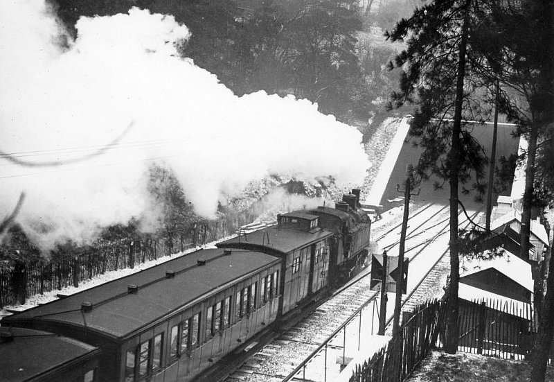 Train de la Petite Ceinture dans la tranchée des Buttes-Chaumont en 1933