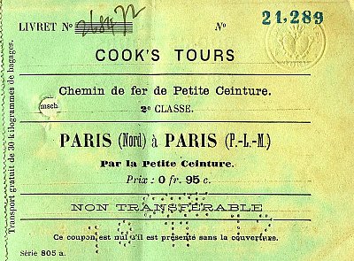 Billet de train délivré par l’agence de voyages Thomas Cook & Son à Londres le 18/11/1912 et permettant d’emprunter la Petite Ceinture entre les gares du Nord et de Lyon à bord d’un train grandes lignes.