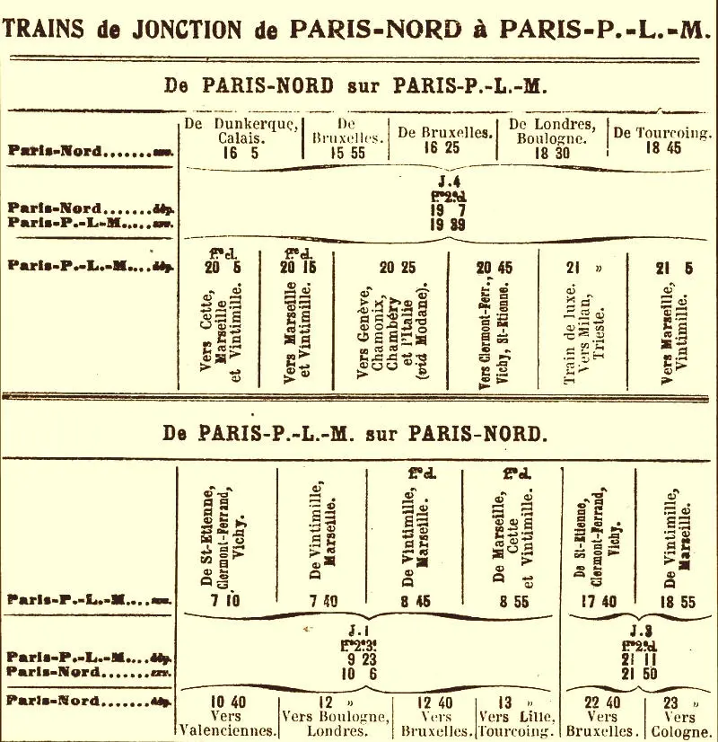 Horaires des trains de jonction empruntant la Petite ceinture entre les gares du Nord (Paris-Nord) et de Lyon (Paris-PLM), au lendemain de la Première Guerre Mondiale.